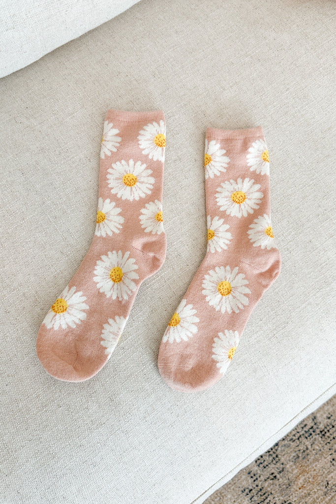 The Daisies Cashmere Crew Socks are our new favorite basics! The rolled detail make them perfect for pairing with boots or Birks! Featuring a daisy pattern, blush color, cashmere blend fabric, crew height snd s one size fits all fit.