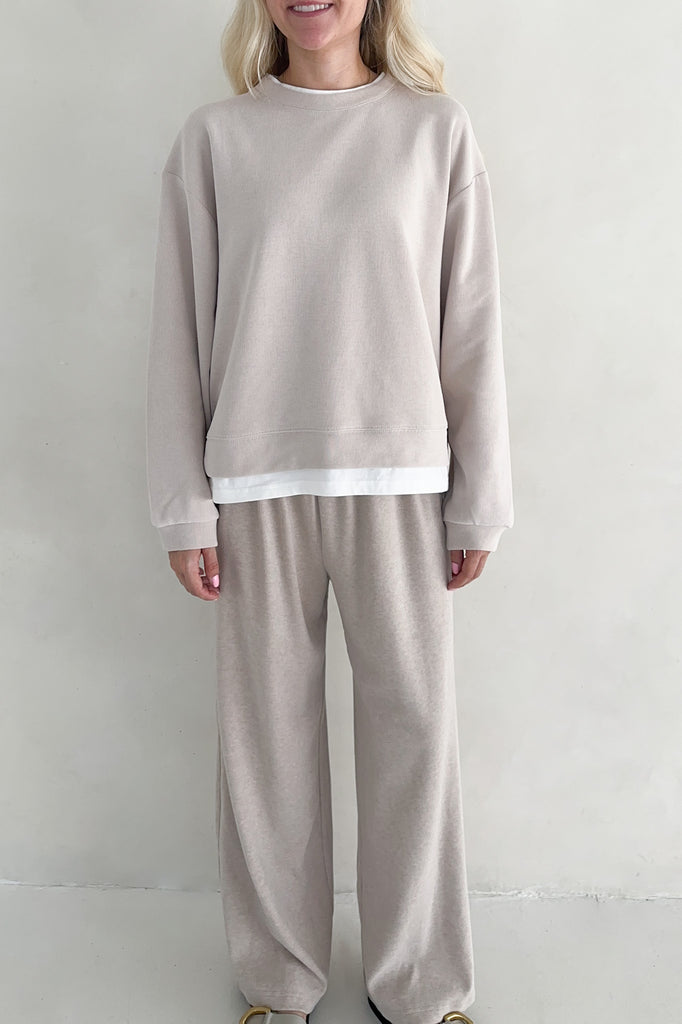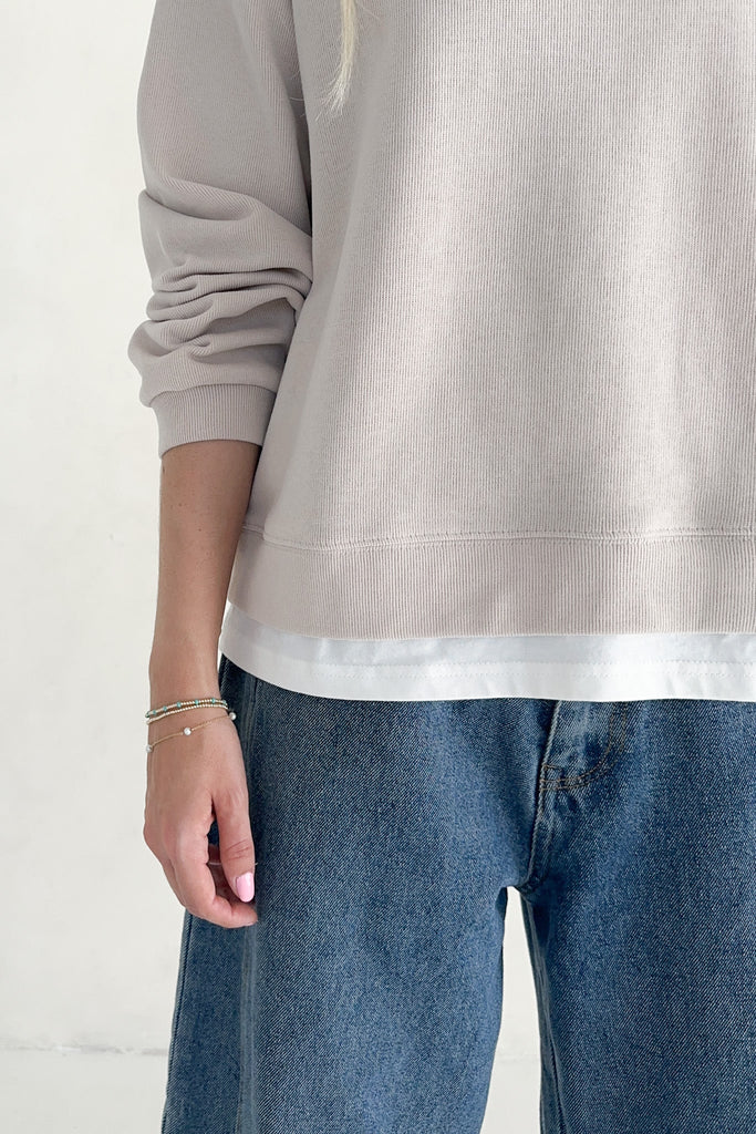 The Sophie Crew Twofer Pullover in Clay is a beautiful top with a layered look and a classic silhouette! Featuring a lightweight feel, clay and white colors, boyfriend silhouette, tee layered contrast details, soft knit fabric and an oversized fit.